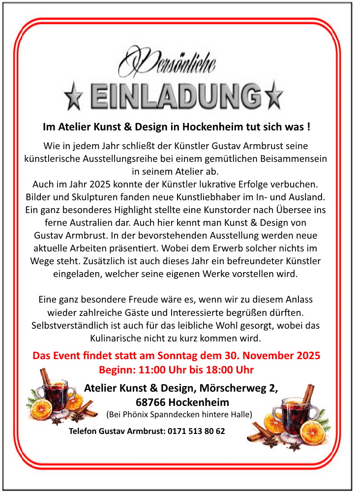 Am erfolgreichen Sonntag klang lediglich die Sommersaison aus. Im Winterhalbjahr ist das Atelier im Mörscher Weg 2 ab sofort jeden Samstag von 11 bis 15 Uhr geöffnet. Oder nach Vereinbarung per E-Mail: gustavarmbrust@aol.com.